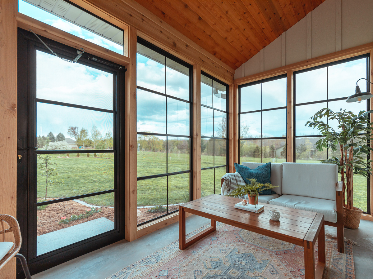 A twist on modern and farmhouse, this sunroom was built to enjoy spectacular views and morning coffee.